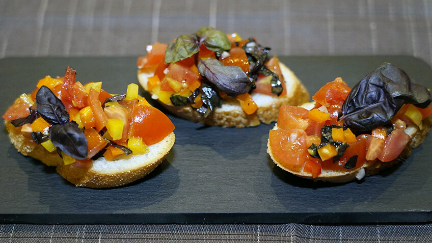Брускетта с томатами и болгарским перцем. Разновидность бутербродов, острое и вкусное блюдо.