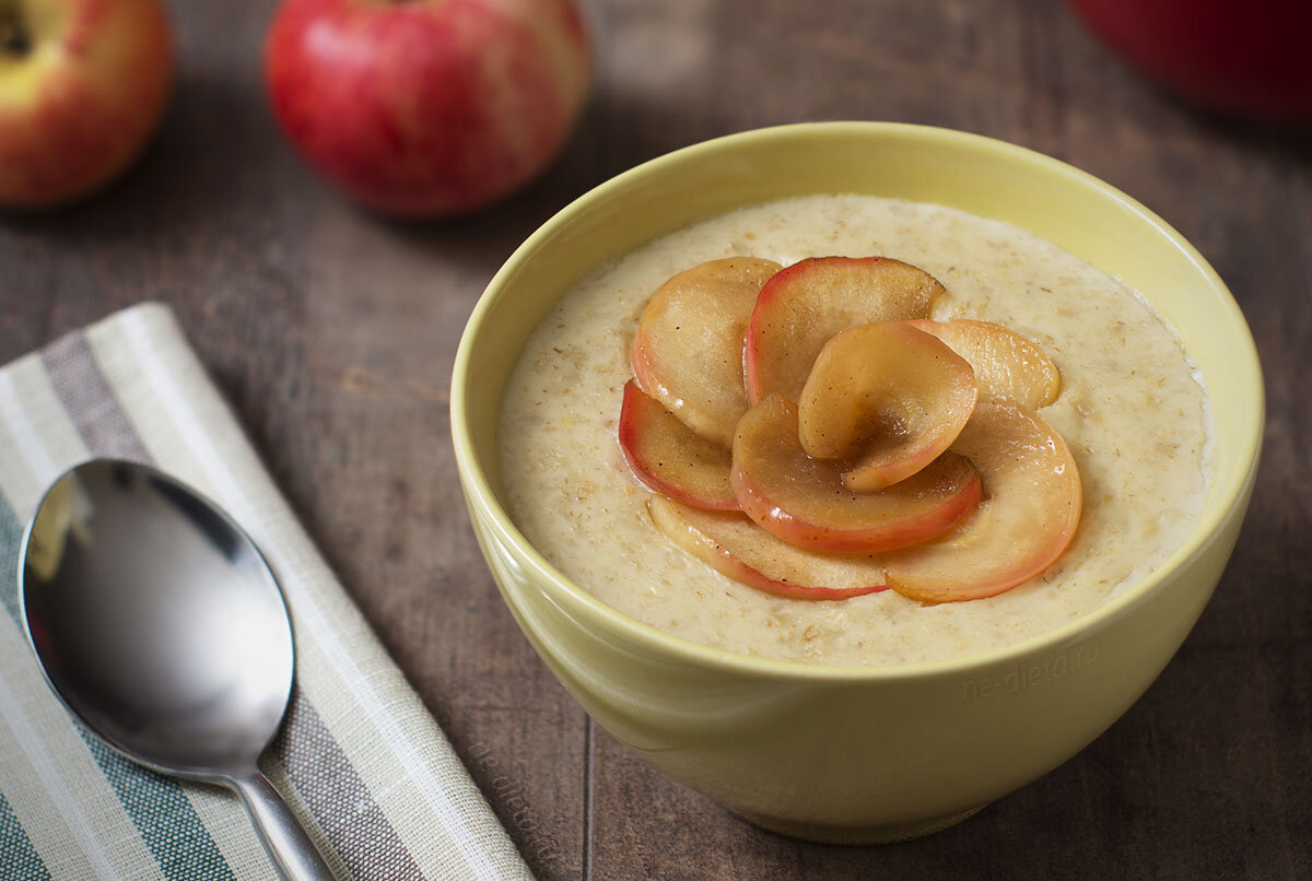 Съедаешь челую миску теплой овсянки и заряжаешься энергией на весь день. Для более полезного варианта можно заменить цельное молоко на обезжиренное или вообще водой. Если у вас нет времени возиться с компотом добавьте для сладости ложку малинового варенья или меда. На 4 порции 600 мл цельного молока 200 мл жирных сливок 200 г овсяных хлопьев Для компота 3 десертных яблока 30 г тростникового сахара 30 г изюма 1 ч.л молотой корицы Совет Если не хотите добавлять сливки, просто используйте больше молока. Приготовление 1. Сначала сварите компот. Соедините все ингредиенты в кастрюле, влейте 2 столовые ложки воды, накройте крышкой и готовьте на слабом огне около 20 минут, до мякоти яблок. В середине варки перемешайте смесь, чтобы она проварилась равномерно. 2. Спарите кашу. В отдельную кастрюлю влейте молоко и сливки, доведите до кипения. Всыпьте овсяные хлопья в термостойкую миски, влейте горячую молочную смесь и хорошо вымешивайте. 3. Перелейте смесь обратно в кастрюлю и варите на сла