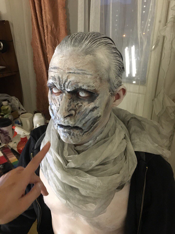 Сегодня расскажу вам короткую и забавную историю одной фотосессии. Иногда бывает нас посещают рандомные идеи для фотосессий и одна из них сделать фото Короля Ночи из сериала "Игра престолов". Придумали образ, сделали костюм, настало время организовывать фотосессию. Главная проблема была в гриме. Использовать полностью фотошоп для создания идентичного образа не хотелось, можно конечно было использовать силикон для грима, но на тот момент это было достаточно дорого, да и достаточного опыта с силиконом не было. И вот тогда Алиса (наш друг ретушер и визажист) предложила сделать грим из крахмала и вазелина. Мы сначала не особо поверили насколько эта техника работает, но все материалы купили. Продавец очень странно на нас смотрела, когда мы покупали 10 тюбиков вазелина в аптеке =) Спустя несколько часов, грим был готов. Какие были основные сложности: 1. Грим из-за вазелина выходит достаточно жирным, необходимо обильно использовать матирующую пудру 2. Плохо крепится к коже (нужно использов