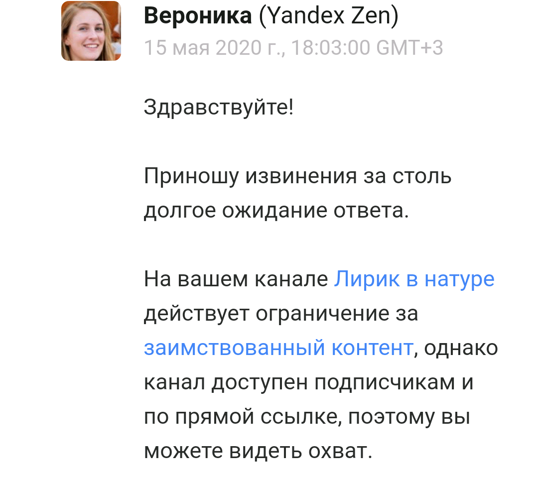 Здравствуйте! Есть у меня АВТОРСКИЙ канал "Лирик в натуре". Сначала его заблокировали за "заимствованный контент", естественно не разъяснив, что и где. Блокировок статей не было и за пару дней до блокировки я интересовался по этому поводу. Когда подошёл срок, это обвинение сняли, но обвинили в "откровенном контенте". Во время блокировки я умудрился достичь монетизации (на одной статье)!!! Сегодня подошёл новый срок и было предъявлено уже новое обвинение, в кликбейте... Что это, ежели не nеDepaSтuя ?! Ведь ни в одном случае меня не ткнули носом, а имея сотню статей понять что и где, просто невозможно. Проведу эксперимент - удалю все статьи, как не жалко и посмотрю, что гомосссэки из службы поддержки придумают ещё. Из вариантов - "язык вражды" или пойти по второму кругу...