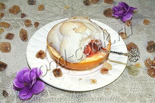 Посыпать сахаром. Духовку заранее разогреть до t=220°C и поставить в неё форму с грейпфрутом на 15 минут. Корочки грейпфрута на срезе должны подсохнуть, а мякоть подняться выше корочек. Безе