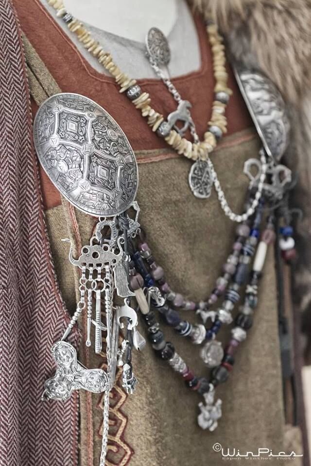 Ибн-Фадлан, арабский купец и путешественник, оставил очень интересноЕ описание украшения викингских))) женщин (русов), о которых довольно много спорят историки: "Что касается каждой женщины, то на груди ее прикреплено кольцо или из железа, или из серебра, или меди, или золота, в соответствии со средствами ее мужа. И у каждого кольца - коробочка, у которой нож, также прикрепленный на груди. На шеях у них (несколько рядов) монист из золота и серебра".