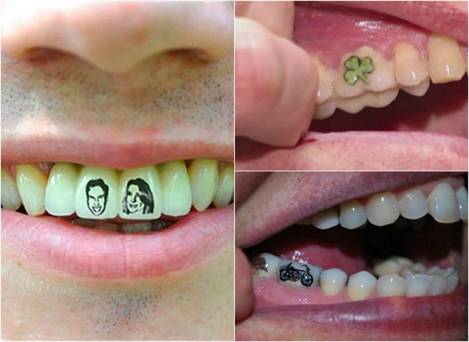 Тату на зубах набивают не обычные специалисты, а опытные дантисты, мастера своего дела, их ещё называют арт-стомотологами. В обычных салонах тату, такую процедуру вам не предложат. Плюсы нанесения изображения на зубы: Минусы нанесения тату на зубы: Для нанесения тату используют перманентные краски. Изображения, виньетки и другие узоры закрепляют на эмали зуба при помощи особого клея, который затвердевает под люминесценцией светоизлучающего диода. Новый вид тату на зубах, можно сделать при помощи коронки с рисунком, который наносят заранее. В Англии такой способ нанесения тату довольно распространен. Татуировки на зубах приобрели заметную тенденцию, среди лондонского высшего общества. Даже Голливуд отстал в этом отношении, отбеленные зубы без всяких узоров у них ещё в моде. Тем более что тату на зубах издалека выглядит как кариес. Набивать наколки себе на зубы сделалось модным и в Японии. Среди девушек, весьма популярным стало составлять композиции из идентичных рисунков на зубах и ногт