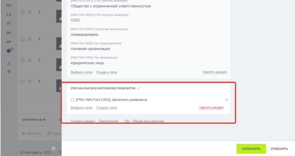 - Новые поля, сгруппированные для удобства в разделы с дополнительной информацией о компании полученной из сервиса DaData.