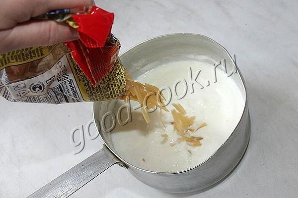 Положить в молоко лапшу или вермишель. Сразу перемешать, чтобы лапшинки не склеились.