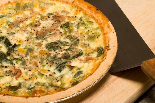 4. Убавьте температуру духовку до 150 – 170 градусов. Смешайте яйца, желток, сливки и оставшийся пармезан. Выложите начинку в форму для пирога, посолите, поперчите и влейте яичную массу.