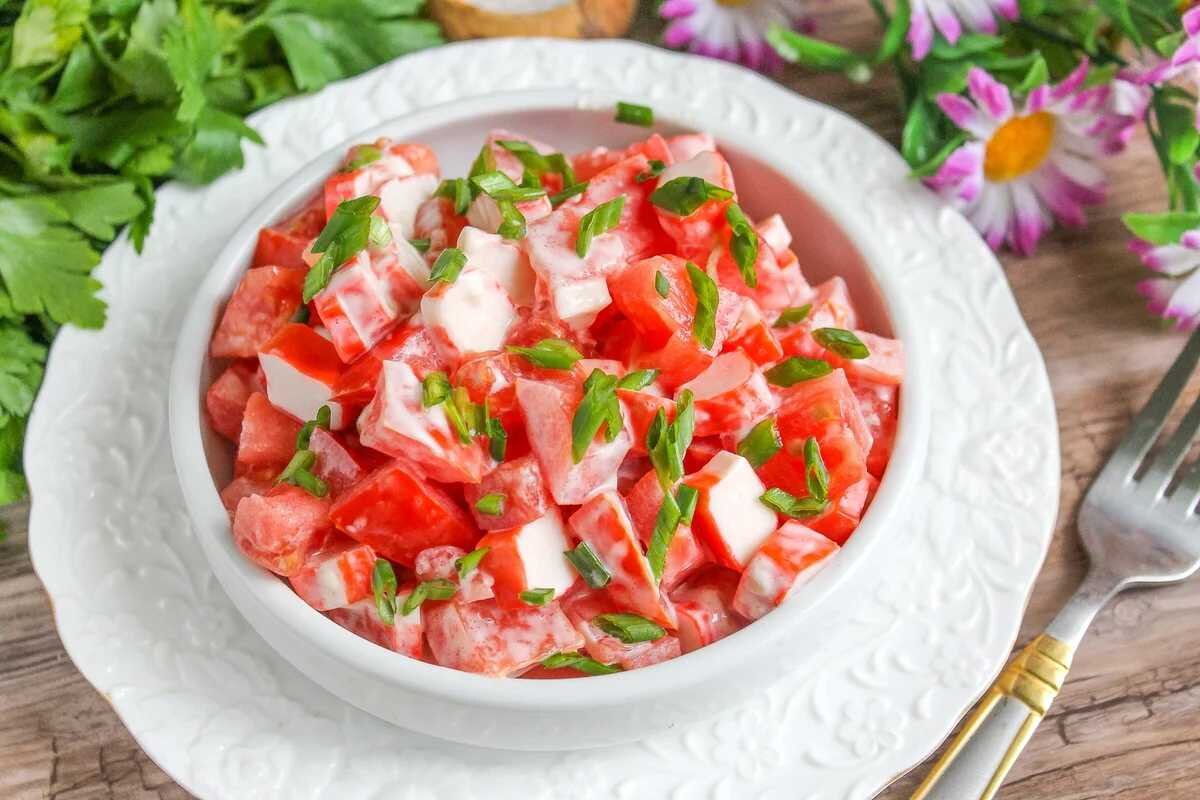 1. Салатик из крабовых палочек с помидорами 1. Салатик из крабовых палочек с помидорами 1. Салатик из крабовых палочек с помидорами Ингредиенты: ● Крабовые палочки - 150 гр. ● Помидор - 1 шт. ● Чеснок - 1 зубчик. ● Сыр твердый ● Майонез - 20 гр. Приготовление: Крабовые палочки порезать наискосок соломкой,Помидор порезать соломкой, (лишнюю жидкость можно слить). Сыр потереть на крупной терке.Выдавить чеснок.Заправить майонезом. Приятного аппетита! 2. Салат Леди - очень вкусно и мега быстро Ингредиенты: ● 300 г куриного филе ● 150 г огурцов ● 150 г консервированного горошка (1⁄2 банки) ● 150 г сметаны ● пучок укропа ● соль Приготовление: 1. Куриное филе отварить в течение 20 минут с момента закипания. Остудить. 2. Огурцы порезать средними кубиками. 3. Укроп мелко порезать. 4. Куриное филе порезать средними кубиками. 5. Сложить в салатник филе, огурцы, укроп, горошек. 6. Добавить сметану, посолить, перемешать. Салат Леди готов, Приятного аппетита! 3