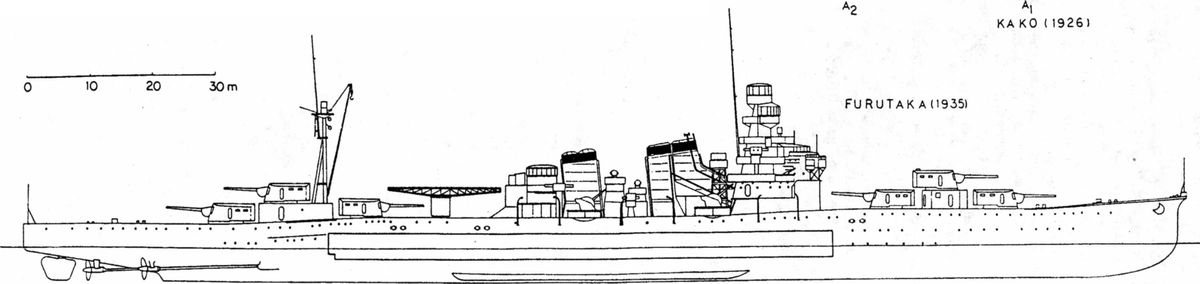 “Furutaka” (1927 год) - увеличены дымовые трубы, установлены прожекторные платформы (кормовая платформа, с правого борта, выше); аналогичные работы на "Како” выполнены в 1926-27 годах