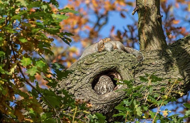Маленькая сова и две белки были сфотографированы в Кенсингтонских садах, Лондон. Два животных ссорились из-за того, что хотели занять одно и тоже дупло на дереве. Первоначально дупло занимали две белки, сова за ними внимательно наблюдала. Как только белки ушли, сова решила занять их дупло. Но белки не сдавались, они решили пересидеть сову и даже легли вместе и грелись под утренним солнцем. Пытались выжить сову махая своими пушистыми хвостиками. Но сова выиграла битву за место.