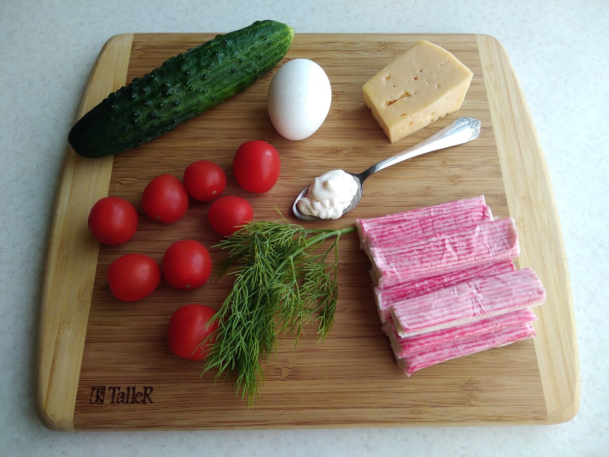 Эта закуска действительно очень легко делается, вкус её достаточно знакомый, так как в основе лежит крабовый салат. Но какое исполнение! Очень нарядно и красиво смотрится на праздничном столе. Огурец лучше резать ножом, попробуйте, у вас получится. Овощечистка очень тонко режет и не даёт той текстуры и хрусткости. При желании можно добавить больше зелени, а для пикантности чесночка. Ингредиенты: Приготовление: 1. Отварите до готовности яйцо. Остудите и почистите. 2. На мелкой тёрке натираем: сыр, крабовые палочки, яйцо. Зелень измельчаем ножом. Добавляем майонез и солим по вкусу. Всё тщательно перемешиваем. 3. Огурец тонко нарезаем на длинные пластины. На край огуречной полоски кладём 1 ст.л начинки. Аккуратно, но плотно скручиваем в рулетик. Зубочисткой фиксируем край огурца, а на оставшийся кончик надеваем помидорку. Таким образом поступаем со всеми ломтиками огурца. Чтобы правильно рассчитать начинку, можно разложить ломтики огурца и на каждый огурчик распределить начинку и только п