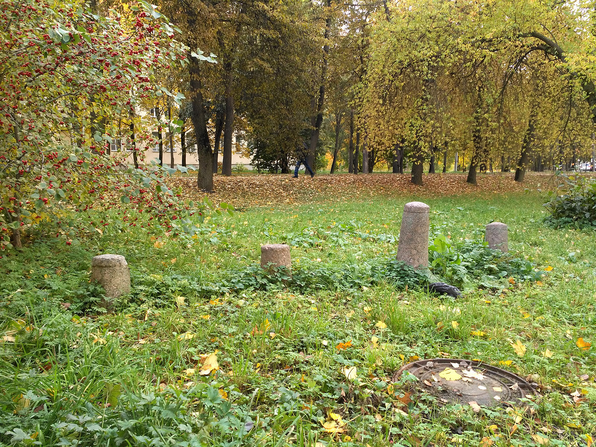 Я люблю коллекционировать фотографии элементов городской среды, поэтому я никак не могла пройти мимо этой стайки столбиков. Но их назначение остаётся для меня загадкой. Я обошла вокруг этих столбиков несколько раз, пытаясь понять, как их можно было использовать в этом месте. Но ответ так и не нашёлся. Придётся принять за правильную последнюю версию: эти столбики появились в этом месте благодаря случайности. Скорее всего тумбы были перемещены на газон во время ремонта, а потом забыты. Эти столбики могли обозначать границу тротуара или стоять при въезде в подворотню для её защиты. Сейчас они просто выстроились в линию по направлению от Софийского бульвара к Колонистскому пруду в Пушкине. Это простые гранитные тумбы, они часто используются в городе как ограничители. Они имеют цилиндрическую форму, верхняя часть обычно немного шире. Часто можно встретить похожие столбики выполненные из чугуна. Чугунные столбики бывают украшены орнаментами. Иногда можно встретить тумбы сложной необычной