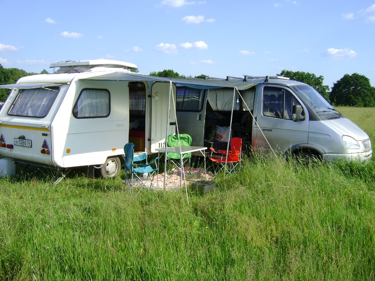 До места стоянки около 60 км. Даже для начинающих путешественников это не расстояние, но часть дороги проходит через лес с лужами, оставшимися после предыдущих дождей. Главной опасностью были низко свисающие ветки, которые грозили оторвать провода, идущие от солнечной батареи во внутрь прицепа. Кроме того, дорога была настолько узкой, что попадись нам встречный автомобиль, ему пришлось бы не сладко. Но в этот день лесная фея была на нашей стороне. И вот мы выехали на полянку. Так как это было воскресенье и первые тёплые дни, то вся территория возле пляжа была занята автомобилями, но мы нашли свободный кусочек и я еле успел его занять. Водитель другого авто, претендующий на это место был, похоже, слегка шокирован увидев несущийся ему навстречу Соболь с прыгающим сзади домом и решил не испытывать судьбу, приняв вправо. Быстро натянув тент и переодевшись, мы бросились в речку. Счастье затмило разум и я забыл о необходимости сфотографировать скопление машин вокруг нас. Но прошло несколько часов и автомобили начали резко испаряться. И вот мы уже одни посреди бескрайнего поля:
