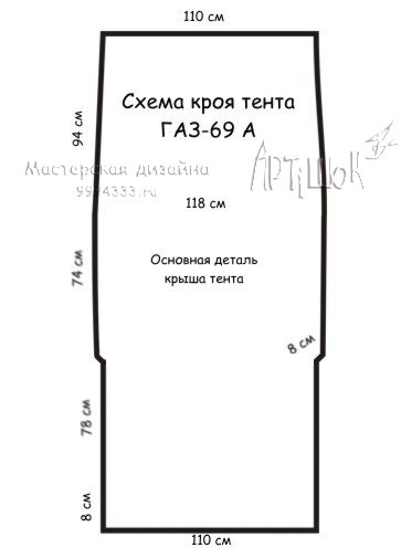 После изучения конструкции стоек и ретро фотографий, у меня получился не прямоугольный, а сложный крой верхней части тента. В центре тента происходит небольшое расширение, которое обязательно следует отражать в крое. Думаю, это основная причина плохой посадки тентов, представленных на рынке, в данном случае упрощение недопустимо.