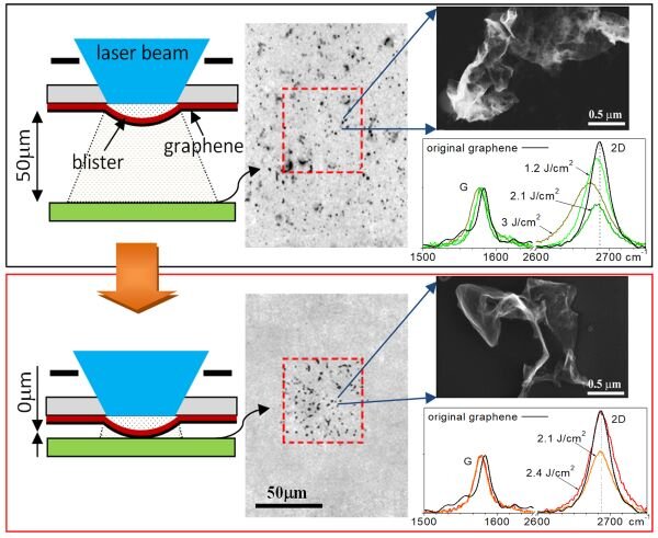 – Суть наших экспериментов заключается в следующем, – рассказывает первый автор статьи в Nanomaterials, старший научный сотрудник Лаборатории лазерной оптики поверхности ИОФ РАН Максим Комленок. – Мы использовали две подложки. Одна выступала в качестве донора, а вторая – в качестве акцептора. Подложка-донор представляла собой кварцевую пластину, покрытую с одной стороны тонким слоем алюминия. На поверхность алюминия переносилась однослойная пленка графена. Далее мы облучали подложку-донор с помощью эксимерного ультрафиолетового лазера. Фокусируя лазерное пятно на границе кварц-алюминий, мы добивались локального нагрева и вздутия алюминиевого слоя. Образующийся таким образом пузырь, так называемый блистер (blister), выталкивал расположенный на его поверхности графен в направлении принимающей подложки-акцептора, сделанной из кремния.