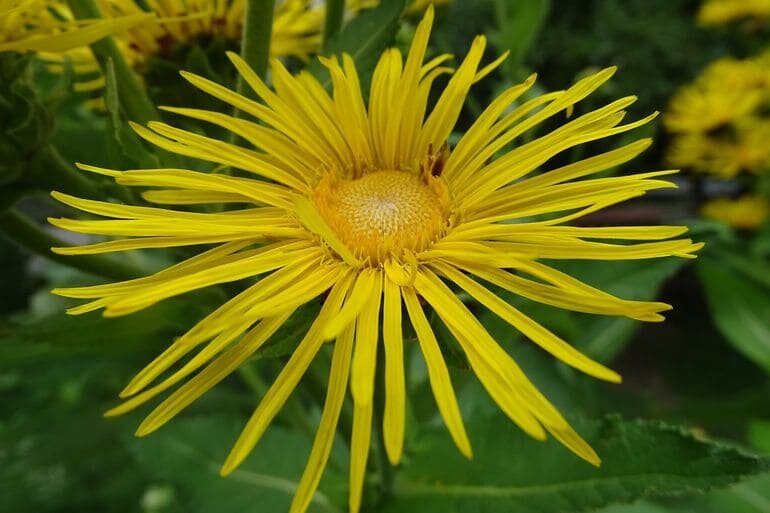 Девясил – это многолетнее растение, которое может достигать 2 метра в высоту. Корневище мясистое, укороченное, от него отходит небольшое число толстых корешков. Соцветия желто-оранжевые, темные в середине, трубчатые, собраны в большие корзинки. Внешне цветок напоминает маленький подсолнух.