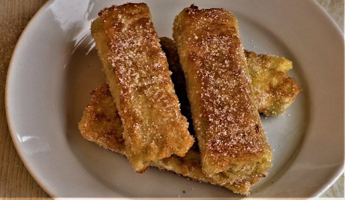 Пока остывают бананы, беру тостовый хлеб, срезаю с него корки, их можно подсушить в духовке или приготовить из них хрустящие палочки, обмакнув их в яйце и обжарив на сковороде.