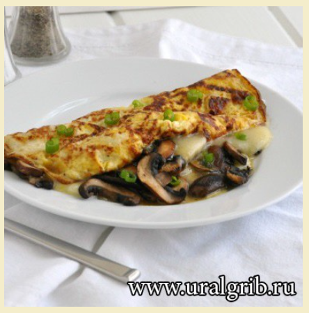 3 Когда омлет будет готов, снимите с огня и подержите под крышкой 2 минуты. После чего покройте грибами с луком, сложите пополам или рулетом и подавайте, разрезая на нужное количество порций.