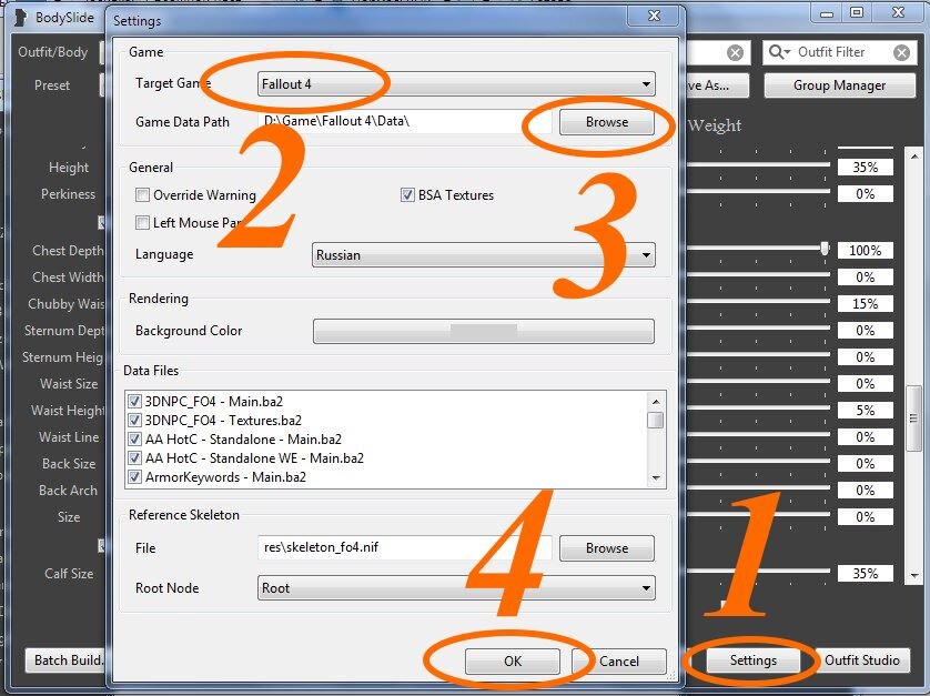 BodySlide - программа, которая настраивает женские тела игровых персонажей и НПС для реплейсера CBBE и одежду под них для игры Fallout 4. Для установки программы можно воспользоваться менеджером модов, например Nexus Mod Mened, или установить ее вручную в папку Data, которая находится в папке с игрой. Напомню, для работы BodySlide сначала должен быть установлен реплейсер тел CBBE. После установки запускаем файл программы BodySlide x64.exe , адрес будет примерно таким: D:\Game\Fallout 4\Data\Tools\BodySlide В появившемся окне в настройках указываем путь к игре: 1. Заходим в настройки Settings 2. Из предложенного списка игр выбираем Fallout 4 3. Указываем путь до папки Data (пример: D:\Game\Fallout 4\Data\) 4. Подтверждаем выбор - ОК Далее выбираем пресет и изменяемую одежду, программа уже содержит несколько стандартных вариантов пресетов, пресеты - это сохраненные параметры тел, под которые будет подгоняться выбранная одежда: 5. В пункте Outfit/Body выбираем нужное тело