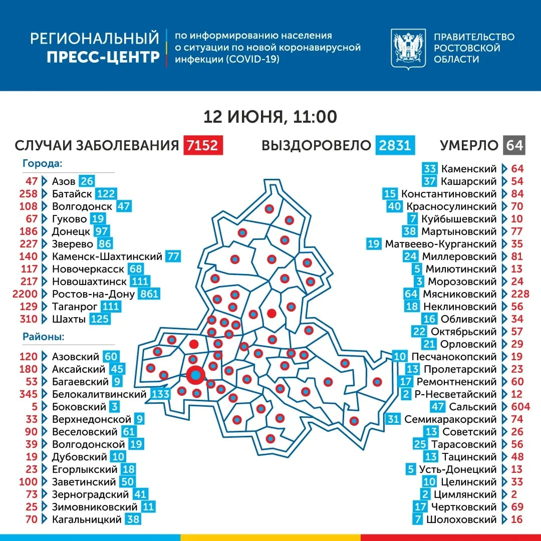 В Ростовской области за прошедшие сутки количество людей, заражённых COVID-19, увеличилось ещё на 198 человек и достигло 7152, сообщает Роспотребнадзор. При этом коэффициент распространения болезни по-прежнему остаётся на уровне ниже единицы, что даёт право властям переходить в смягчению ограничений на территории региона. Новые инфицированные за сутки зарегистрированы в 26 городах и районах региона. Больше всего в Ростове-на-Дону (92), Белокалитвинском (13) районе, Батайске (11), Неклиновском (8) и Семикаракорском (7) районах. За последние сутки в регионе умерли сразу пять человек с COVID-19 — 12-летний ребёнок с тяжёлым врождённым заболеванием центральной нервной системы, 34-летняя женщина с гипертонической болезнью и хроническим заболеванием печени, 66-летний мужчина с осложнениями заболеваний сердечно-сосудистой системы, 64-летний мужчина с хроническими заболеваниями сердечно-сосудистой системы, гастроэнтерологическим и онкологическим заболеваниями, а также 83-летний мужчина с серде