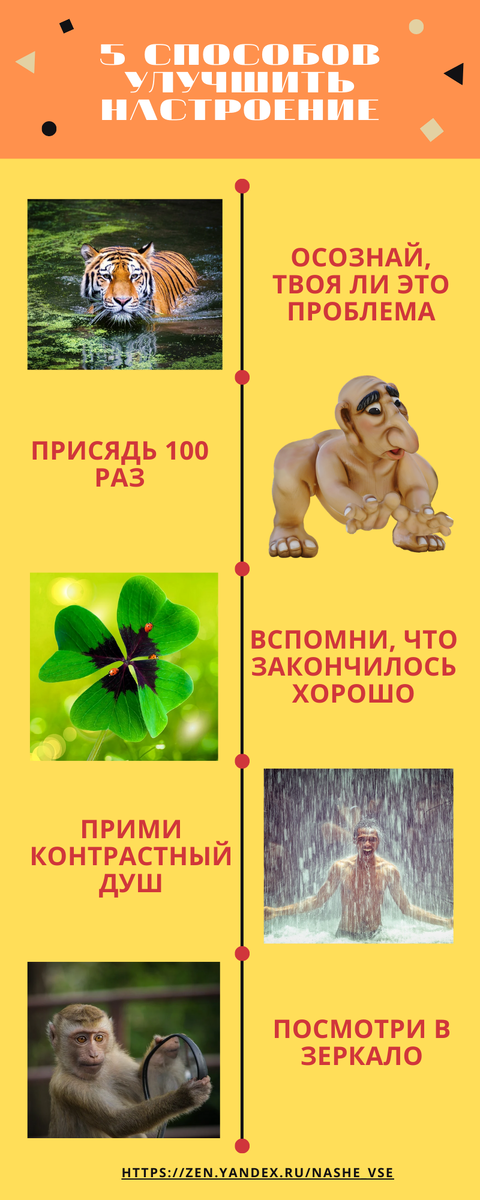 Все мы часто впадаем в уныние, переживания, плохое настроение. Причины у каждого свои: проблемы с деньгами, плохая погода, общий трындец, творящийся вокруг. Море, просто океаны причин! Само по себе плохое настроение — это нормально. Невозможно всегда ходить довольным как слон. Но если это случается часто или вообще постоянно — надо что-то делать. Ведь наш эмоциональный фон влияет на все, что происходит в нашей жизни. Девушка с кислой миной вряд ли познакомится с принцем, а парень с дергающимся глазом и трясущимся от гнева подбородком, вряд ли понравится принцессе. Именно поэтому делюсь техниками, которые мне помогают переключить настроение с состояния «полное днище» до состояния «оказывается, все не так уж и плохо», а иногда и до состояния «да все просто зашибись». 1. Осознай, твоя ли это проблема Имеешь ли ты влияние на эту проблему, которая портит тебе настроение, влияет ли эта проблема на тебя напрямую? Ответь на два этих простых вопроса. Если ты страдаешь из-за тропических ливней
