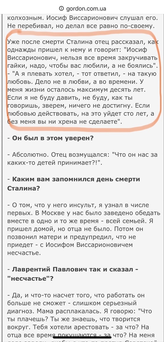 Читаю интервью сына Берии. Его последнее интервью, после которого он скончался. Был такой товарищ Берия, отвечавший за атомный проект и не только. В один период Сталинского правления, второй человек в стране. Убит Хрущевым. И вот читаю интервью, там много всего, есть и про Сталина. Мне и без интервью известно, что это за личность, я изучал его историю. И как бы думаешь, сколько же принёс вреда, с одной стороны. Сколько поломанных судеб, сколько горя, сколько трупов... Одна коллективизация чего стоила... Я уже не говорю про выкошенную интеллигенцию, офицерский состав, полный провал в 41-ом и многое другое... Но когда я читаю о нем или его афоризмы, я всегда задаю себе вопрос, это он что-то знал такое, что так действовал? Или все-таки социопат? Человек получавший удовольствие от причинения боли другим? Упырь? Моральный урод? Как можно отправлять в лагеря сотни тысяч, арестовывать жён соратников? Ломать ближайших людей? А ведь были и те, у кого на глазах насиловали их родных, на допросах