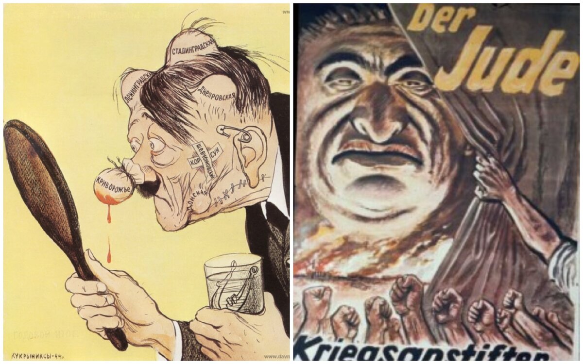 Так изображался гитлер творческим объединением "Кукриниксы" - их карикатуры были очень популярны среди советского народа за максимальное соответствие реальным фактам. Второй плакат немецкий с надписью "Евреи - поджигатели войны". На плакате изображен Сталин, которого немецкая пропаганда выставляла виновником происходящего кровопролития. Такая пропаганда была популярной, но не несла практически никакой правдивой информации.