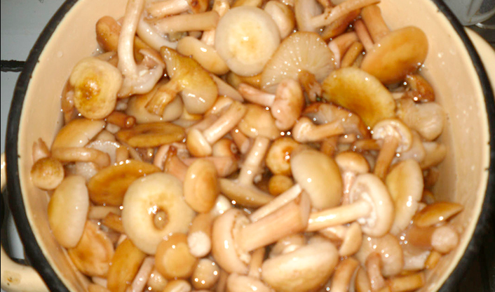 1 Опята вымыть и варить в подсоленной кипящей воде в течении 10-15 минут, постоянно снимая пену. Отваренные грибы откинуть на дуршлаг, дать воде стечь.