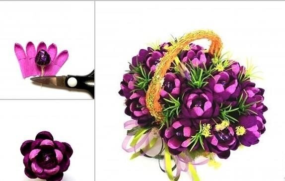 Чтобы создать сладкий букет, вы увидите: ваши любимые конфеты вашей помощи; бумага гофрированная с двумя общими цветами и зелеными листочками; деревянные шампуры для шашлыка (можно заменить коктейльными трубками или достаточно прочной проволокой); пенополистирол или специальная цветочная пена; упаковочная пленка для букетов; специальная лента для упаковки букетов; плетеная корзина (по желанию); скотч или нить соответствующего цвета. Как сделать цветок? Если цветная упаковка конфеты подходит, просто посмотрите на нее с кусочком прозрачной опасной фольги, если нет - с пленкой соответствующего цвета, чтобы на вертеле был прикреплен упаковочный зуб. Используйте ленту или нить, чтобы прикрепить конфету к вертелу. Выберите два прямоугольника разных цветов из гофрированной бумаги: один будет 7,5 см х 11 см, а другой 10 см х 11 см. Сделайте четыре надреза на прямоугольниках на равных расстояниях, не разрезая 2 см до конца. Вы должны получить 5 "лепестков". Сожмите верхнюю часть лепестков (около 4,5 см), используя фантик. Согните, используйте детали вниз. Есть два шага для цветка, по 5 лепестков в каждом. Используйте конфеты на шампуре с меньшим основанием, закрепите его ниткой или скотчем. Используйте полученный бутон с большей базой, исправьте это. Цветок готов.