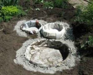 Затем верхняя часть на шине осторожно обрезается при помощи острого ножа и откладывается в сторону. Уже обрезанная покрышка укладывается в вырытую яму в земле. Некоторые рекомендуют, как гидроизоляцию, использовать клеёнку.