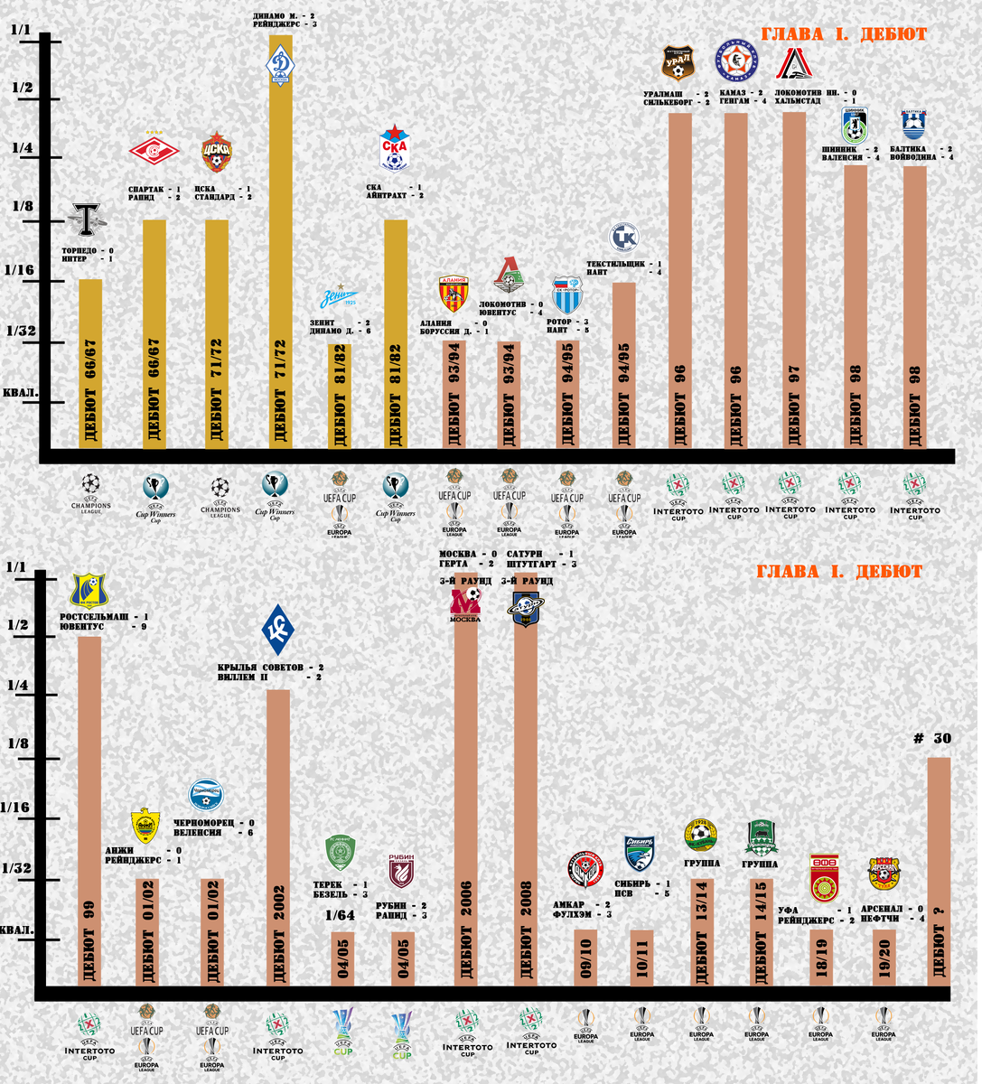 Наша история о том, чего добились российские клубы в еврокубках и когда они стартовали. Мы выяснили, что 6 российских команд дебютировали в Европе ещё во времена СССР : Торпедо, Спартак, ЦСКА, Динамо (Москва), Зенит и СКА (Ростов-на-Дону). Остальные стартовали в новейшей истории. На данный момент 29 представителей России участвовало в еврокубках. Предлагаю узнать, какие самые высокие достижение в турнирах УЕФА. ЦСКА первым в новой истории пробился в Лигу Чемпионов. Клуб в сезоне 92/93 прошел 2 раунда и выбыл только после группы. Которая, к тому моменту, соответствовала ¼ финала. но наивысшее достижение принадлежит Спартаку (1/2 финала). В кубке УЕФА была самые значительные успехи - 2 кубка и 1 полуфинал. В Кубке Интертото российские команды трижды доходили до 3-го раунда (2006, 2007, 2008), который был на тот момент последним этапом. Как вы думаете, можно ли эти три сезона приравнять к выходу в финал? Возвращаемся к первому графику и доваляем наивысшие достижения каждой ком