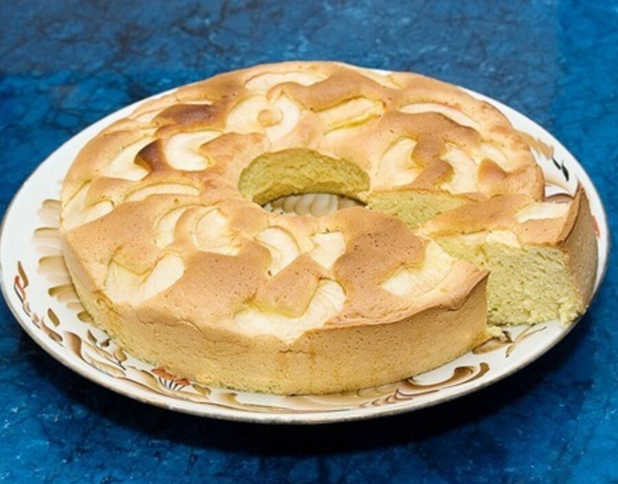 Ингредиенты: -Сахар (3 столовые ложки) -Яйцо куриное (1 штука) -Пшеничная мука (3 столовые ложки) -Яблоко (0,2 кг) -Соль на кончике ножа -Сода по вкусу Инструкция приготовления: 1. Белки взбить с половиной стакана сахара. 2. Желтки взбить с оставшимся сахаром. 3. Соединить все вместе и постепенно добавить муку 4. Добавить соль и соду. 5. Добавить нарезанные кубиками яблоки. 6. Форму для выпекания смазать маслом и посыпать манной крупой. 7. Выложить массу в форму и поставить в духовку, разогретую до 180 градусов. 8. Выпекать 30-40 минут. 9. Приятного аппетита!