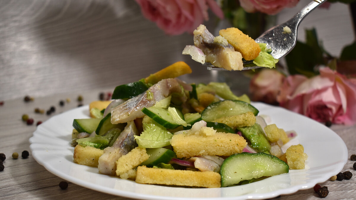Многие из нас обожают селедку и я в том числе. Обожаю ее просто в качестве закуски, канапе с селедкой тоже просто объедение но еще салаты с селедкой это всегда просто бомба. По этому хочу поделиться с Вами салатом за пять минут с селедкой и сухариками. Этот салат не только быстро готовиться но и вкус у него отличный. Такой салат готовить лучше всего перед самой подачей на стол что бы сухарики не успели размокнуть или же сами сухарики добавьте перед подачей. Салатик легкий, простой и к тому же он отлично подойдет для праздничного стола или повседневного меню, тут решать Вам.