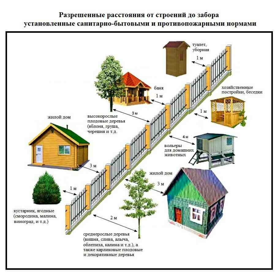 Какие деревья посадить на участке вдоль забора и на каком расстоянии? В соответствии с действующими нормами высокие стволы должны находиться примерно в пяти метрах от дома, минимальный метраж составляет три метра. Оптимальный показатель расстояния от хозяйственных сооружений составляет четыре метра. От гаража, летней кухни и прочих помещений, следует располагать зелёные насаждения не менее одного метра.