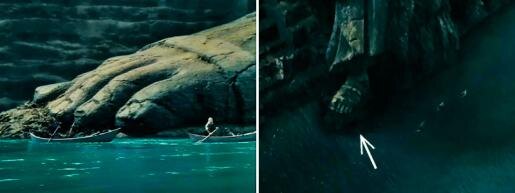 - После того, как «Братство кольца» покинуло Лесное королевство, они сплавлялись по реке. На первом кадре можно заметить, что лодки совсем близко к ноге статуи, но дальше они каким-то странным образом удалились.