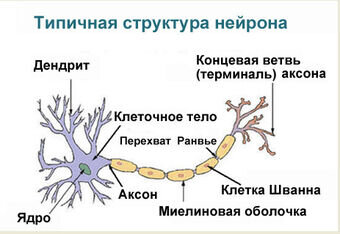 Аксон (др.-греч. ἄξων — «ось») — нейрит (длинный цилиндрический отросток нервной клетки), по которому нервные импульсы идут от тела клетки (сомы) к иннервируемым органам или другим нервным клеткам. Каждый нейрон имеет, как правило, один аксон. Передача нервного импульса происходит от дендритов или от тела клетки (сомы) к аксону, а затем сгенерированный потенциал действия от начального сегмента аксона передаётся назад к дендритам или соме. Если аксон в нервной ткани соединяется с телом следующей нервной клетки, то такой контакт называется аксосоматическим, с дендритами — аксодендритическим, с другим аксоном — аксо-аксональным (редкий тип соединения, встречается в ЦНС). Концевые участки аксона, называются – терминалами, эффекторными синапсами, которые разветвляются и контактируют с другими нервными, мышечными или железистыми клетками мишенями. Постсинаптическая мембрана клетки-мишени и синоптическое окончание аксона - вместе образуют синапс, через который передаётся возбуждение (сигнал). В аксоплазме (протоплазме) аксона имеются тончайшие волоконца — нейрофибриллы (как и в соме нейрона), а также микротрубочки, митохондрии и гладкая (а гранулярная) эндоплазматическая сеть, образованная мякотными (при наличии миелиновой, мякотной оболочки аксона) или без мякотными (лишёнными миелиновой оболочки) нервными волокнами. Миелиновую оболочку аксонов образуют «накручивающиеся» на аксон специальные шванновские клетки (в ЦНС — олигодендроциты), между которыми остаются свободные от миелиновой оболочки участки — перехваты Ранвье, только на которых и присутствуют потенциал-зависимые натриевые каналы и заново возникает импульс потенциала действия, распространяющийся по миелинизированным волокнам ступенчато, что позволяет в несколько раз повышать скорость его распространения. Скорость передачи сигнала по покрытым миелиновой оболочкой аксонам достигает 100 метров в секунду. При, диаметре в несколько микронов, длина аксона может достигать 1 метра и более (например, аксоны, идущие от нейронов спинного мозга в конечности). При прочих равных условиях с увеличением диаметра аксона увеличивается скорость проведения по нему нервных импульсов. У без мякотных аксонов меньшие размеры длины, чем у аксонов, покрытых миелиновой оболочкой, что компенсирует потери в скорости распространения сигнала по сравнению с мякотными аксонами. Нервный импульс генерируется в аксоне в начальном сегменте на расстоянии ~50 мкм от тела нейрона, что обеспечивается повышенной концентрацией натриевых каналов (в сто раз по сравнению с телом нейрона).