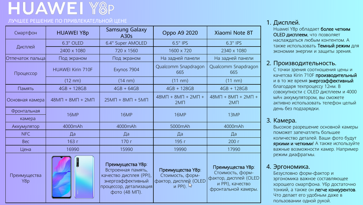 Сравниваем Huawei Y8p c Samsung A30s, Oppo A9 2020 и Xiaomi Note 8T.