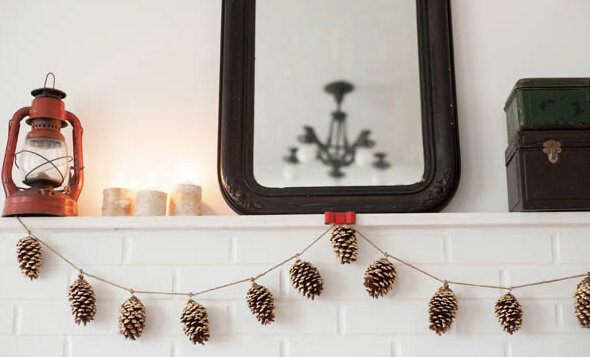 Красивая гирлянда из золотых шишек. Ее можно повесить дома, украсив интерьер, и не обязательно в праздник. Вам понадобится: - шишки - джутовая веревка - краска-спрей золотого цвета - золотистая фольга - губка - винт с крючком - щипцы 1. Сначала нужно нанести клей ПВА на шишки - для этого используйте губку. * Желательно все шишки почистить от пыли и грязи, перед тем как наносить клей. 2. Дайте клею немного подсохнуть, но не ждите слишком долго. 3. Пока сохнет клей, приготовьте винты с крючками. * При желании можете краской-спрей золотистого цвета подкрасить винт. 4. Возьмите золотую фольгу и размельчите ее, после чего посыпьте маленькие кусочки фольги на шишки. Они приклеятся в том месте, где вы нанесли клей. 5. Приготовьте щипцы и начните вкручивать винты в шишки, чтобы далее их можно было повесить на веревку и создать гирлянду. * Можете, конечно, просто руками вкрутить винты, но проще будет щипцами, если они у вас есть. Не обязательно стараться вкрутить винт прямо