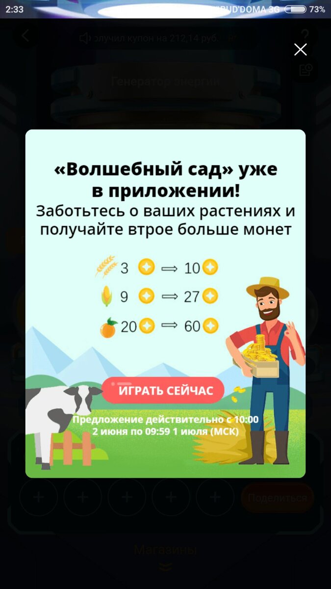 Уже месяца три наверное, как я удалил почтового клиента mail.ru с телефона. Первое время было тяжело, но сейчас уже привык. Во первых, освободилось порядка 500-800 Мб, и реже стал брать телефон в руки. Следующим, я считал, будет приложение Aliexpress. Постоянный сбор монеток, участие в Халяве. Месяц назад, меня остановило то, что был анонсирован купон 300 или 400 рублей, если за 3 недели набрать 500 монет. В принципе набрать такую сумму было не сложно. И я набрал горадо больше. Но купон я не получил, ни на одном из трех аккаунтов, которые у меня есть. Потом я спрашивал знакомого, он тоже не получил. Говорит, было всплывающее сообщение, что нужно зайти, получить купон. Т.е. купон не давался всем участникам, а быстрее всего было ограниченное количество, и нужно было успеть взять в определенное время. В конце мая в приложении появилась "ферма" - "Волшебный сад". Я так понял, что на замену "Денежному дереву". И где то через неделю, увидел информацию, что дерево скоро закроют. Этот сад, еще
