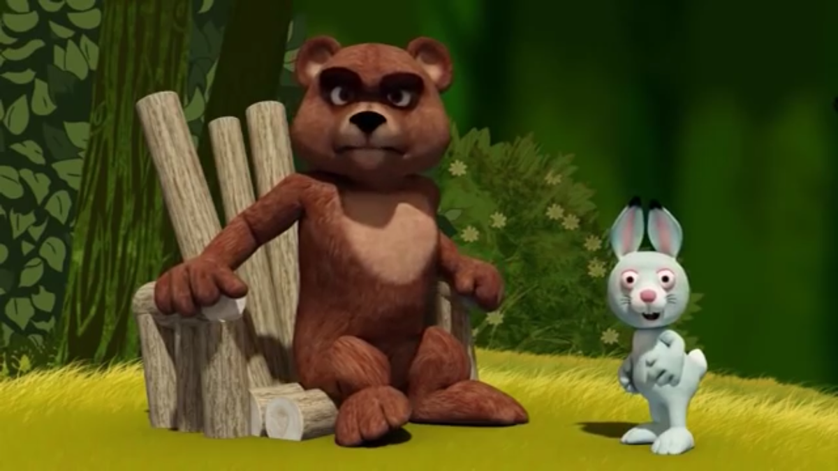 Медведь и зайцы - мультфильм. Отличный мультик на казахском языке. Можно посмотреть здесь.