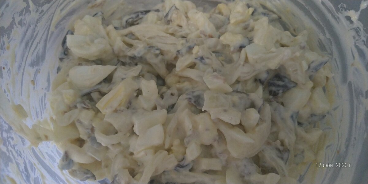 Поместить в миску, остудить. Добавить к баклажанам рубленные вареные яйца и маринованный лук. Салат из жареных баклажанов, яиц и лука посолить, поперчить, добавить майонез. Тщательно салат перемешать и поставить в холодильник на 20-25 минут.