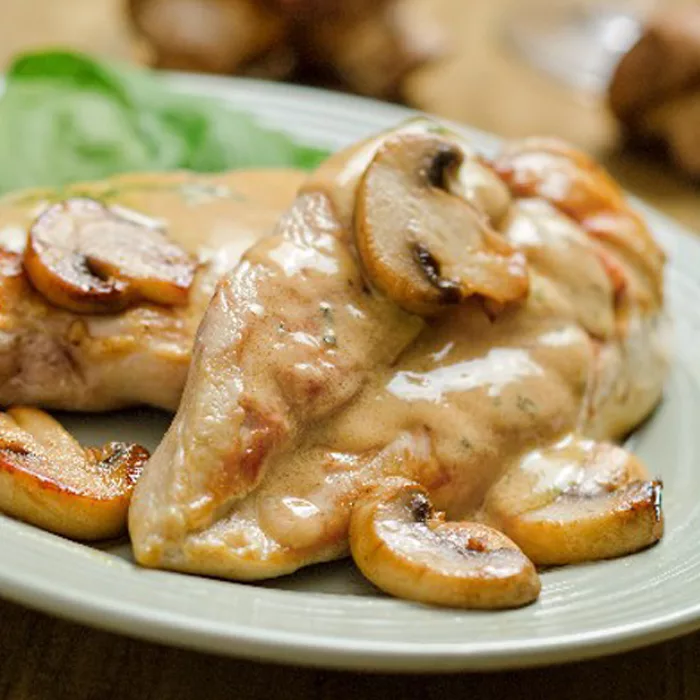 -Мякоть курицы и грибы нарежьте ломтиками, посолите, прогрейте и перемешайте с белым соусом с яичными желтками.