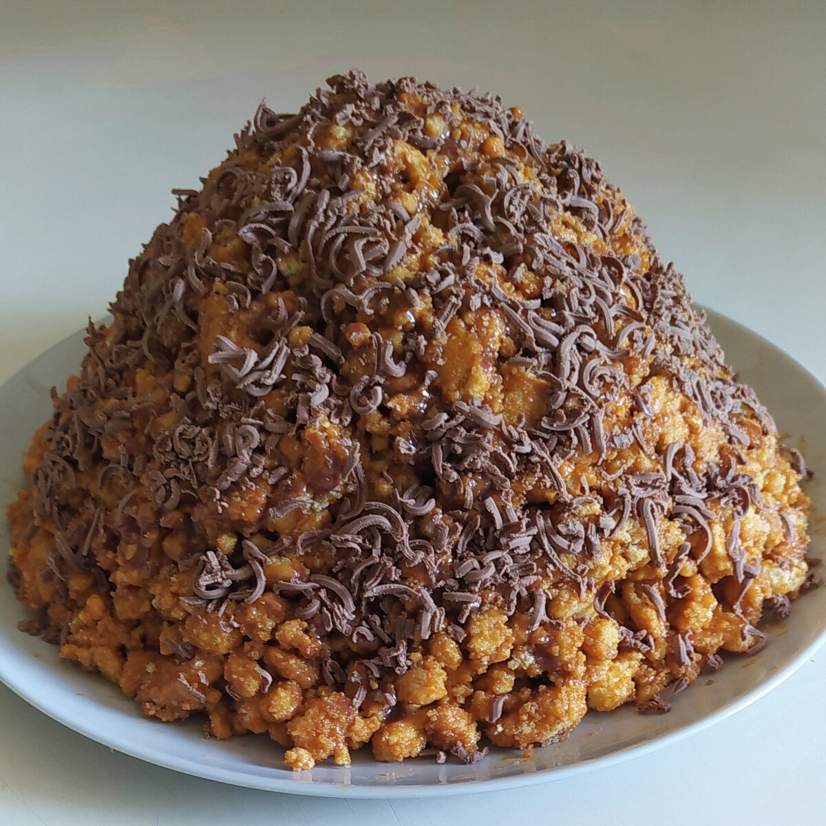 Ингредиенты: 360гр Маргарин 3шт Яйца 200гр Сахар 1ч.л (без горки) Разрыхлитель 450гр Мука пшеничная 250гр Мука кукурузная 1банка варёной сгущёнки. ❗Можно ещё пол банки сгущенки добавить, чтоб горка получилась менее сухая, но мне и так нравится, потому что коржики получаются рассыпчатые) Для украшения: Молочный шоколад. Готовим: 🔹Растопить маргарин. 🔹Взбить яйца с сахаром. 🔹Перемешать остывший маргарин с яичной смесью. 🔹Добавить просеянную муку с разрыхлителем, замесить тесто. У меня получилось очень мягкое тесто. 🔹Поделить тесто на маленькие части, разложить на блюдо и убрать в морозилку на 1ч-1:30ч. ➡️ Достать две части теста и потереть на крупной тёрке. ➡️ Разложить равномерно на противень застеленный пергаментом. ➡️ Выпекать в разогретой духовке до 180°С ~15-20 минут, в зависимости от толщины слоя теста. ➡️ Даём чуть остыть, чтоб не обжигало руки. Коржик ломаем не сильно мелко в глубокое блюдо. ➡️ Смешиваем с варёной сгущёнкой (у меня одна банка). ➡️ Выкладываем на тарелку ф
