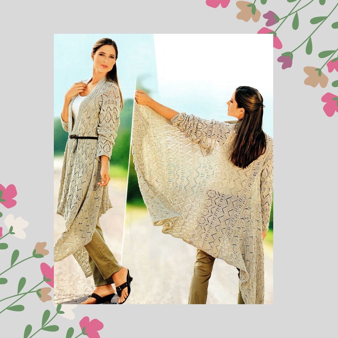 Это ажурное великолепие вяжется спицами. Важная особенность - вяжем в поперечном направлении. Потребуется 450 г (для размера 38-42) и 550 г ( для размера 44 - 46) смешанной пряжи (хлопок-полиамид 125 м/50 г) и спицы № 4,5. Плотность вязания: резинка 1 х 1 и 2 х 2 - 22,5 п и 31 р. = 10 х 10 см, ажурный узор - 28,5 п. и 31 р. = 10 х 10 см. Ажурный узор вяжем по схеме Число петель должно быть кратно 10 + 1. Изнаночные ряды вяжем по рисунку, накиды провязываем изнаночными.Повторяем рисунок с 1 по 94 ряд. Спинка и полочки вяжем единым полотном. Стрелка на выкройке указывает направление вязания. Набираем 171 (181) п. и вяжем планку: кромочная, 145 п (155) резинки 1х1, 24 п. резинки 2х2, кромочная. Через 4 ряда вяжем следующим образом: кромочная, 4 п. резинки 1х1 по рисунку, 141 (151) п. ажурного узора, 24 п. резинки 2х2, кром. Через 60 см = 186 р (57,5 см = 178 р) от планки закрыть для проймы в лицевом ряжу последние 47 (50) п. перед петлями резинки 2х2, в следующем ряду снова их набрать и