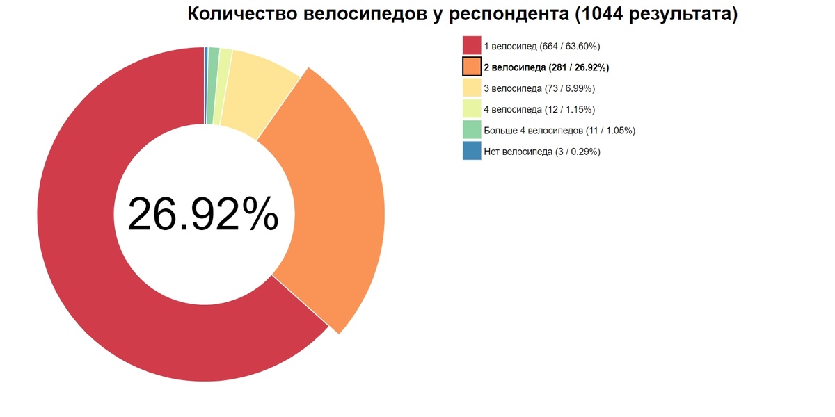 Новая визуализация к опросу — количество велосипедов у респондента. Сам интерактивный график опубликовал по ссылке. Почти у 27% опрошенных, в хозяйстве не один, а два велосипеда, у почти 7% — три велосипеда, а 1 проценту респондентов я вообще завидую — у них больше четырёх велосипедов.