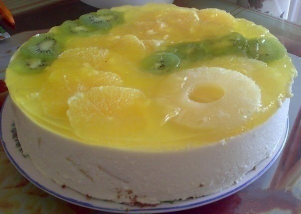 6. Желе приготовить как указано на пачке, остудить до комнатной температуры. На торт выложить красиво фрукты и залить их желе. Опять поставить в холодильник. Когда полностью з