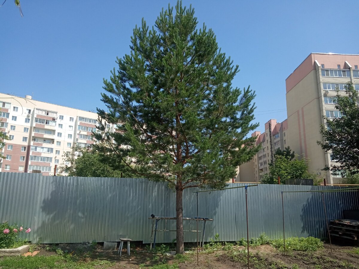 Я очень часто задаю себе этот вопрос. Огород у меня небольшой, а тут это огромное дерево, которое много полезной площади занимает. Не было бы этой ёлки, я бы столько всего ещё посадила полезного. Но ведь под ней ничего не растёт. А от этой сосны какой толк? Сейчас расскажу. Когда маленькую ёлочку из лесу принесли домой, я даже не подумала зачем она нужна. У бабушки спросила разрешение, где можно посадить, она и указала на это место. И вот из маленького, хиленького деревца выросла эта красавица. Наверное бабушка моя была провидицей, что около забора надо сажать. Никто же не думал, что через несколько лет появятся девятиэтажки. А так как все мы люди, и жителям этих домов также свойственно любопытство, вот они и смотрят вниз кто чем занимается. Кто-то сказал: "Ничего нет прекраснее, смотреть как течёт вода, как горит огонь и как работают другие". Вот елочка и служит мне живой ширмой от постороннего взора, когда я пашу на огороде кверху попкой. Ох, сколько же хлопот с этой сосной. То сохн