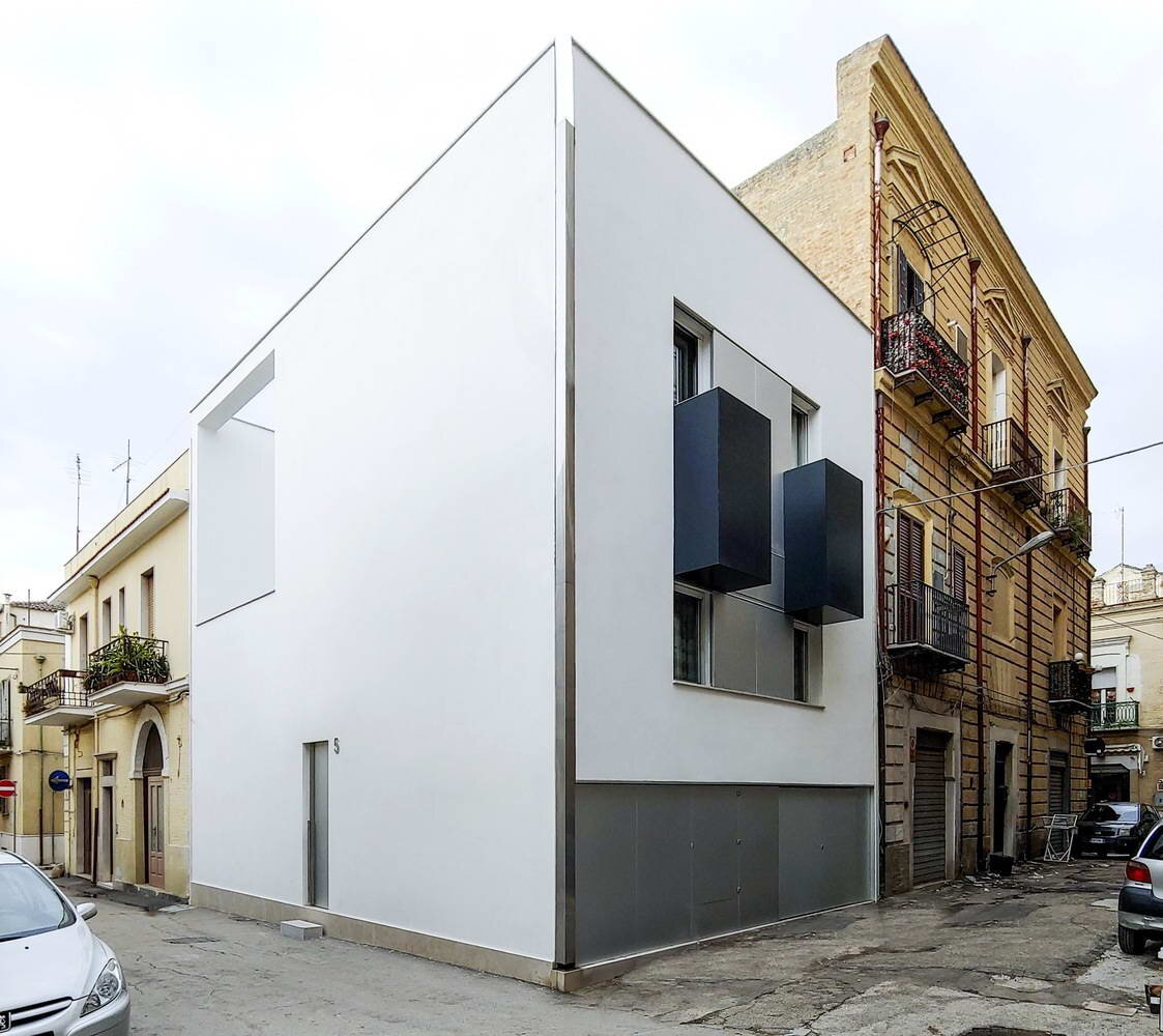 Идея этого замкнутого дома начинается с необходимости блокировать вид на внутреннее пространство с улицы. Сплошной блок нового здания, расположенного в углу, которому противостоят прилегающие фасады.