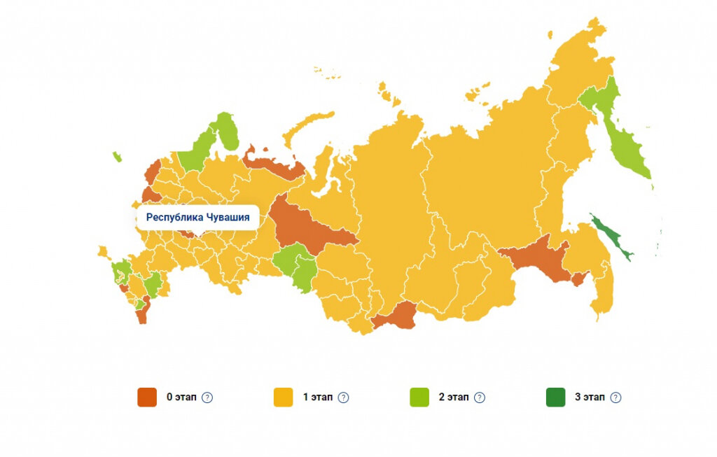 На данный момент в Чувашии: Обнародована интерактивная карта Чувашия находится на нулевом этапе выхода из режима самоизоляции. Информация об этом размещена на карте, которую опубликовал сайт стопкоронавирус.рф. В пятницу, 12 июня, появилась интерактивную карту выхода из самоизоляции. По ней можно узнать, на каком этапе выхода из режима самоизоляции находится конкретный регион, какие ограничения уже отменили, а какие еще действуют. Каждый из субъектов федерации окрашен на карте одним из четырех цветов, означающих степень снятия карантинных мер безопасности в нем. Судя по карте, Чувашия находится на нулевом этапе, регион окрашен в темно-оранжевый цвет. Это означает действие запретов, которые были введены из-за пандемии новой коронавирусной инфекции.