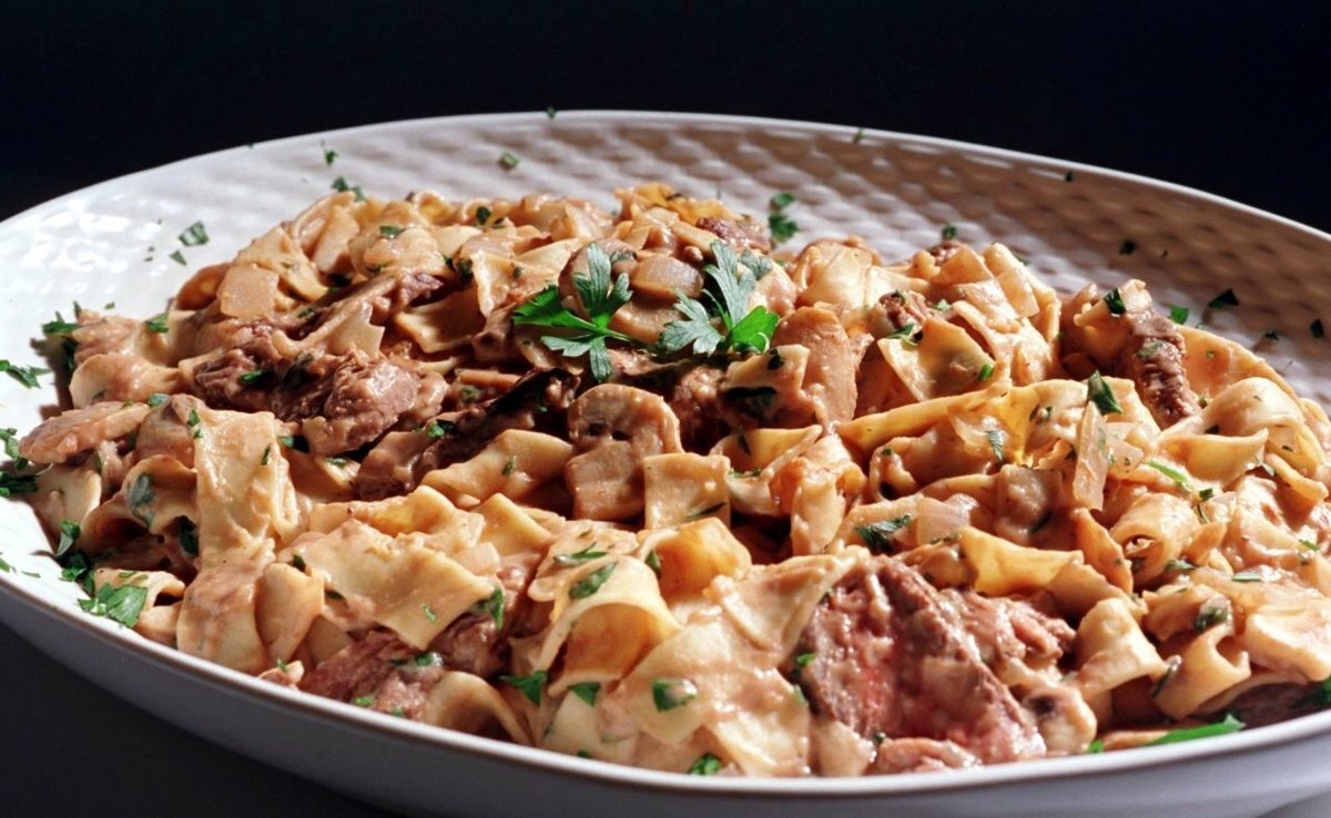 Бефстроганов — популярное блюдо русской кухни, приготовленное из мелко нарезанных кусочков говядины (тонкие квадратики) , залитых горячим сметанным соусом. Также могут иметь место названия «Беф-Строганов», мясо по-строгановски. Ингредиенты: 1) Говяжий фарш - 1кг 2) Яичная лапша - 400г 3) Шампиньоны - 150г 4) Говяжий бульон - 2 стакана 5) Сметана - 1 стакан 6) Лук - 1шт 7) Масло сливочное - 50г 8) Мука - 4 ст.л 9) специи Приготовление: 1) Отворить яичную лапшу и отложить в сторону. 2) На большой сковороде обжарить шампиньоны и лук на сливочном масле . Обжаривать на среднем огне до размягчения . Отложить в миску . 3) Обжариваем фарш пока не подрумянится . Затем добавляем муку и перемешиваем , вливаем бульон и варим пока немного не загустеет . 4) Добавляем грибы с луком . Затем помешивая добавляем сметану . Приправляем солью и перцем по вкусу . Прогреваем не доводя до кипения . 5) Выкладываем на тарелку лапшу и сверху поливаем мясным соусом . Приятного аппетита !