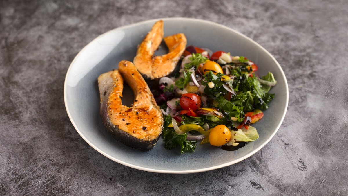 4. В салатницу добавляем смесь салатов, болгарский перец, лук, редис, помидоры «Черри», масло, соль и орешки. Хорошо перемешать. 5. Перейдем к приготовлению рыбы.